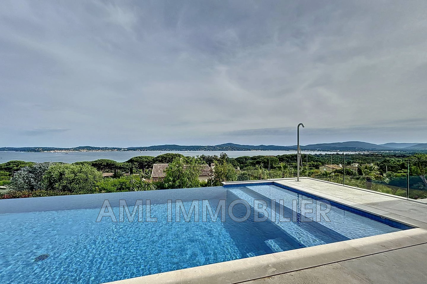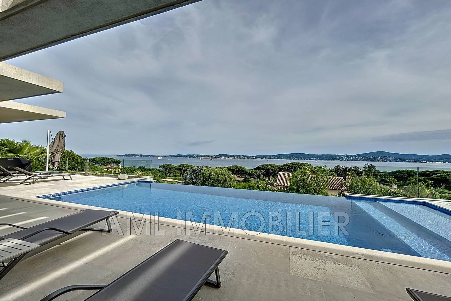 Terrasse avec salon de jardin, table de repas, bains de soleil, piscine à débordement de 4*10m, douche extérieure