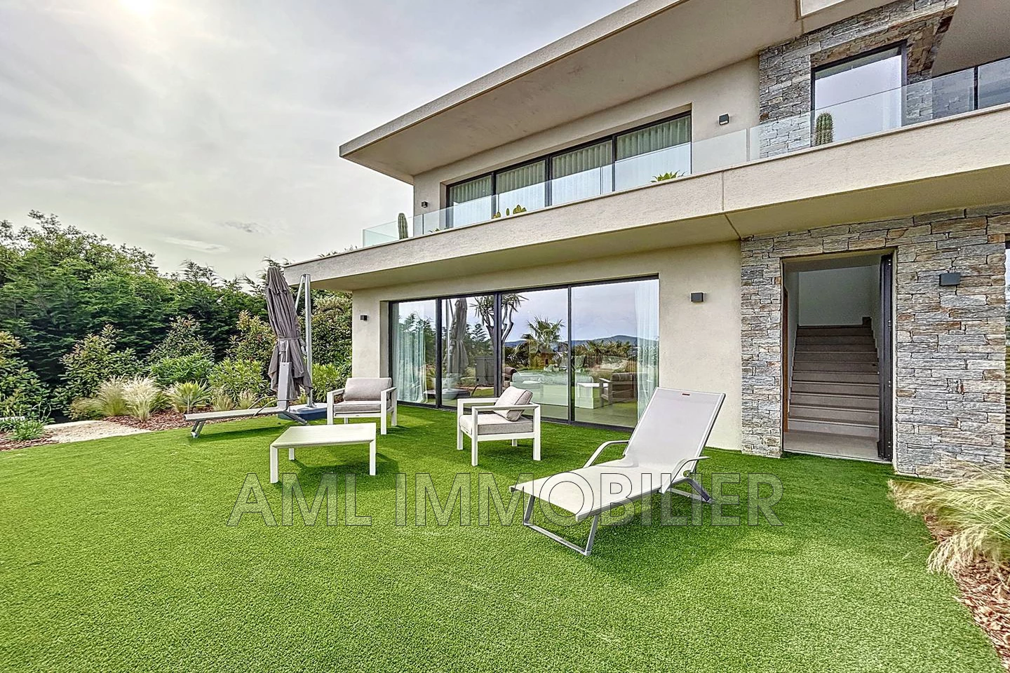 Terrasse avec salon de jardin, table de repas, bains de soleil, piscine à débordement de 4*10m.