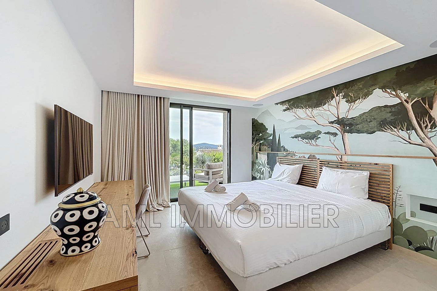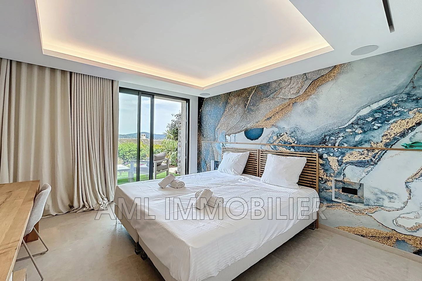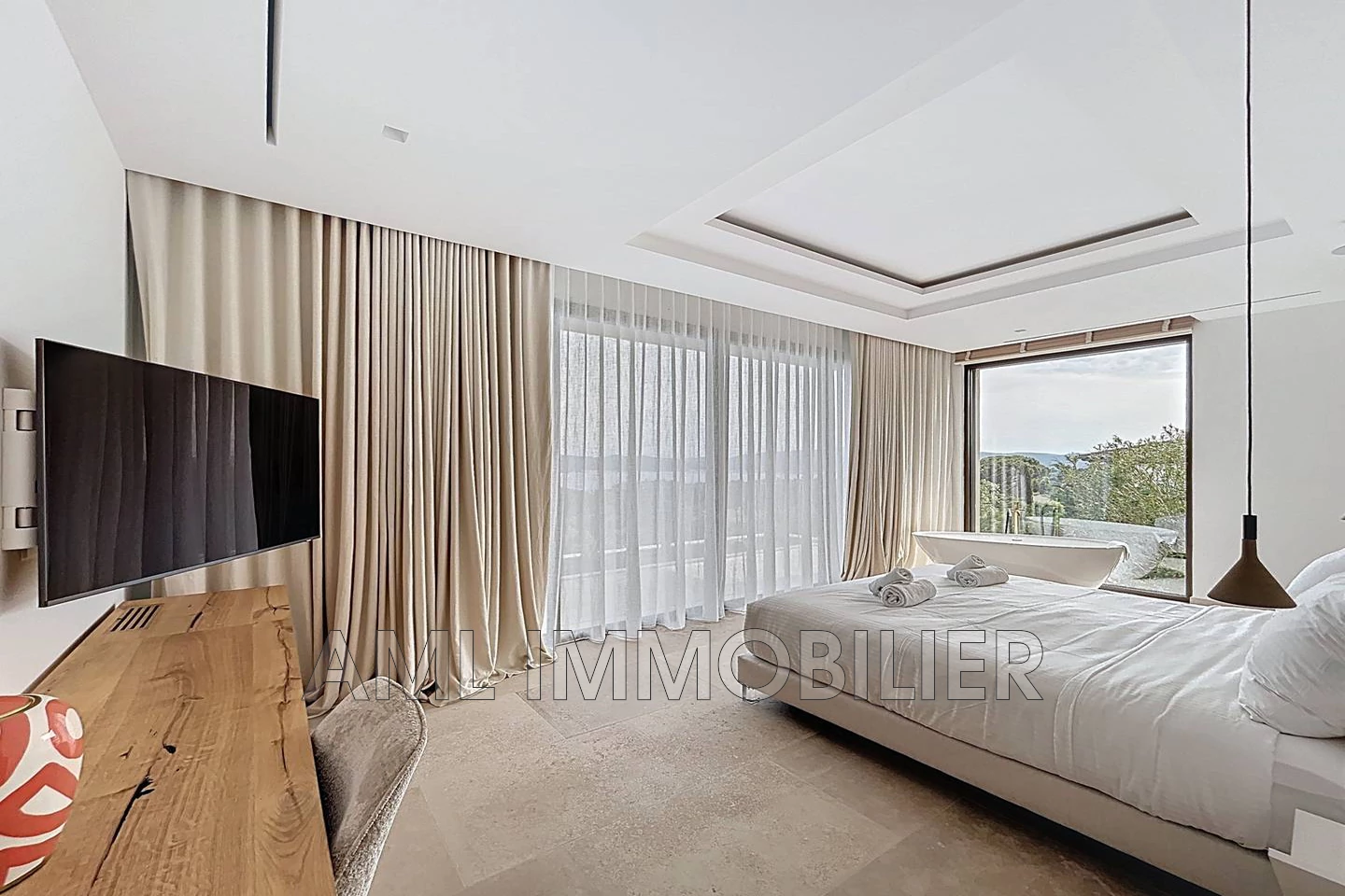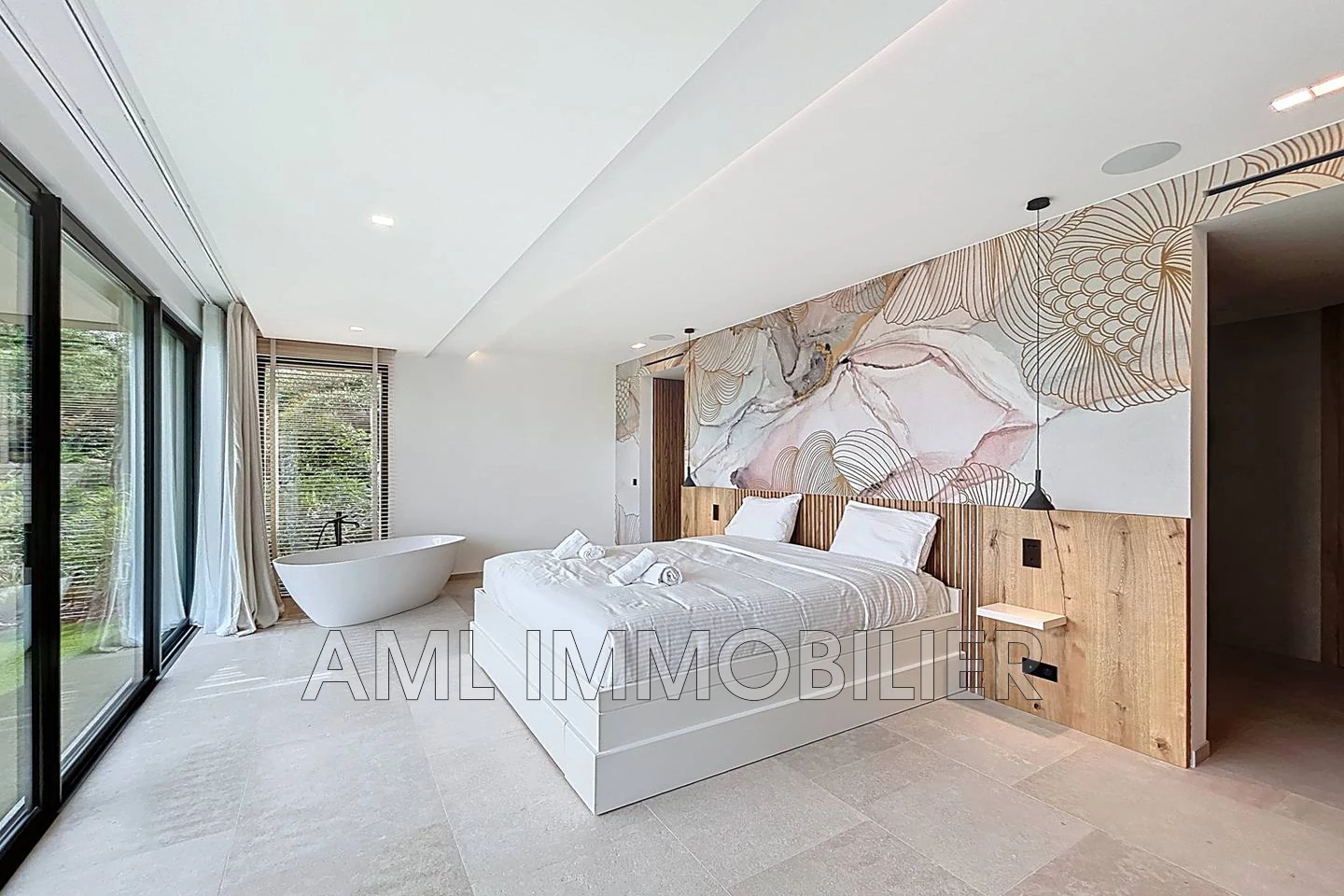 - 1 Master Bedroom avec dressing, salle d'eau avec grande douche, baignoire (dans la chambre, vue jardin), WC indépendant, TV, minibar, coffre-fort, lit de 180*200 cm.